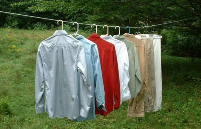 - Постиранные в большом количестве рубашки и брюки повесить на вешалки во всю длину и разместить на веревке.