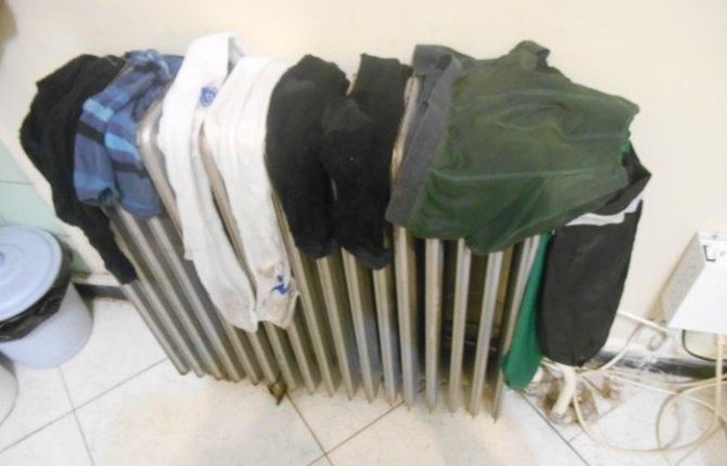 - Батареи и обогревательные приборы не следует использовать для сушки, хоть они и ускоряют процесс. Под воздействием сильного прямого нагрева ослабевает структура нитей ткани, и одежда деформируется.
