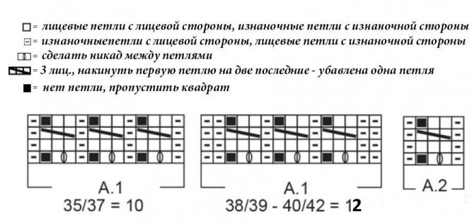 След. р.: 3п. планки – платочн. узор, петли схемы А.2 повторенные 12; 12; 13 раз, 3п. – вторая планка. Продолжаем вязать обувь, используя этот мастер-класс и схемы до высоты голенища 12см. Заканчиваем крайним рядком схемы. Затем связать 4р. платочным узором, в первом из которых убавить по 1п. над каждой из кос. У нас 42; 42; 45п. Закр. п.