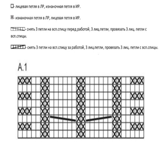 Продолжаем: связать 1кр, узор схемы А.1, 1кр. Вывязываем вертикальный раппорт сх. А.1 4; 5; 6 раз. Получаем длину 7; 8,5; 10см. В след. р. убавляем кромочные п. и центральную п. Получаем 9; 11; 11п. Берем в работу отложенные п. и поднимаем по бокам от центр. части по 12; 14; 16п. Получается 60; 66; 72п. В дальнейшем в работе замеры будем выполнять от этого места. Устанавливаем маркер на центр. п. передней части и центр. п. на заднике.