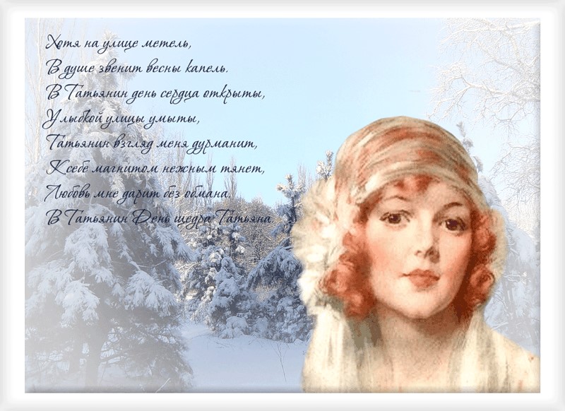 Приметы и обряды: В народной традиции Татьянин день связан с различными приметами. Считалось, что если в этот день будет мороз, то год будет удачным и плодородным. Также существовала примета, что если девушка в этот день встретит свою любовь, то она выйдет замуж в ближайшее время.