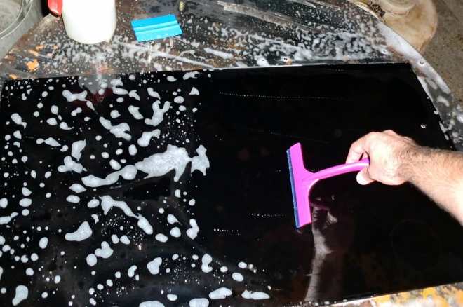 - затем они опрыскиваются мыльным раствором, пока не прилипнут к поверхности стекла с пленкой;