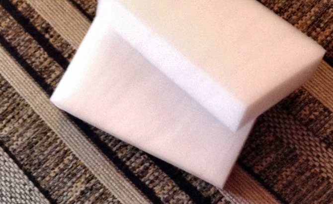 За лето пленка успевает пересохнуть, и структура полимера становится хрупкой. Её необходимо хорошенько пропитать водой чтобы убрать. Вырежьте кусок полотна, на 10-20 мм больший по длине/ширине размеры пластикового оконного стекла, такой, чтобы он немного загибался на ПВХ-профиль оконных рам. Смочите его в растворе с ПАВ. Для этого можно использовать любое моющее средство, но лучше всего – средство для мыть посуды – «Фэйри», «Сорти», «Дося», «Капля» и т.п. или средство для мытья окон.