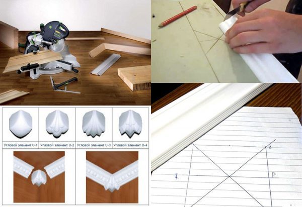 1. Самое сложно в установке потолочного плинтуса это запил внутренних и внешних углов. Причем правый и левый плинтуса в углу запиливаются по-разному. Кроме этого внешний ми внутренний угол также запиливаются совсем по-разному. Если вы не каждый день запиливаете потолочные плинтуса, то перед началом работ сделайте четыре запиленных угла-макета: правый внутренний, левый внутренний, правый внешний, левый внешний.