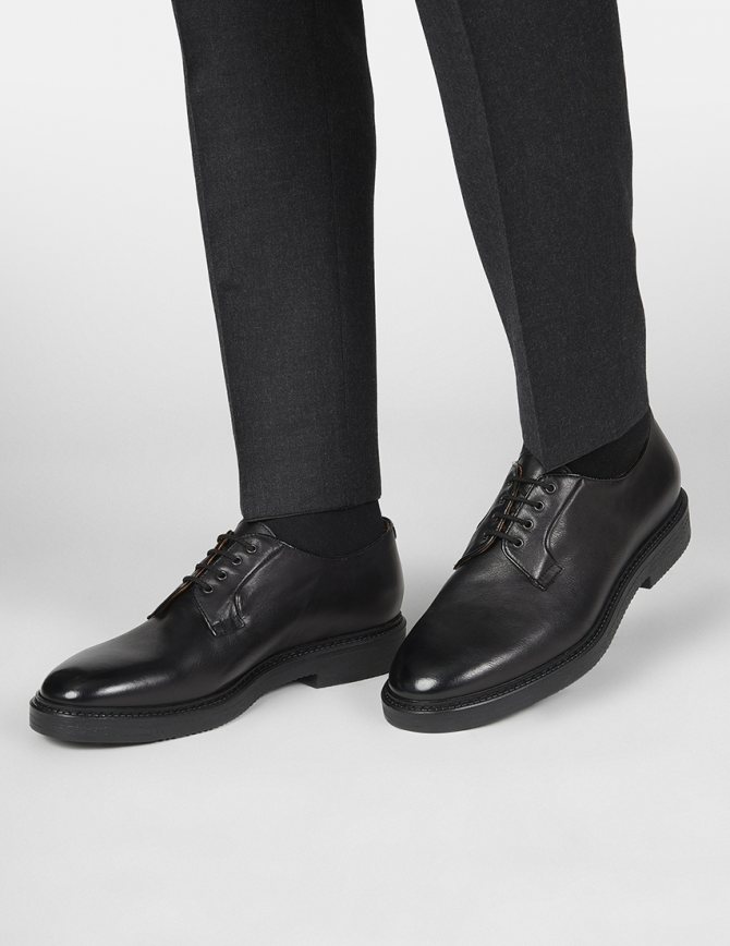 Особое внимание следует уделить обуви и аксессуарам. Туфли просто обязаны быть в идеальном состоянии. Универсальным цветом считается черный, он уместен в большинстве случаев. При выборе модели стоит обратить внимание на дерби или оксфорды.