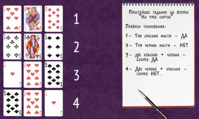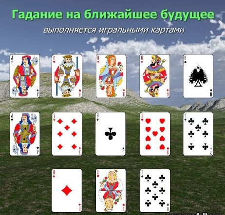 При гадании на игральных картах расклад интерпретируется довольно просто — все зависит от того, какие карты легли первыми. Также можно использовать привычные расклады из Таро.