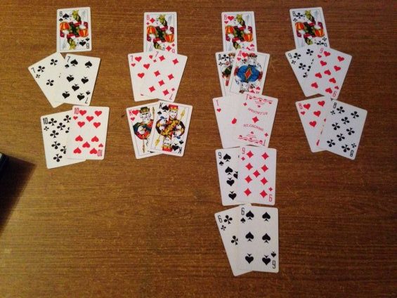 Колоду нужно распределять на 5 стопок поэтапно. Обязательно левой рукой, то есть той, что принадлежит сердцу. Должно выйти 5 стопок по 3 карты в каждой, после чего нужно положить еще одну карту отдельно, но также в ряд.