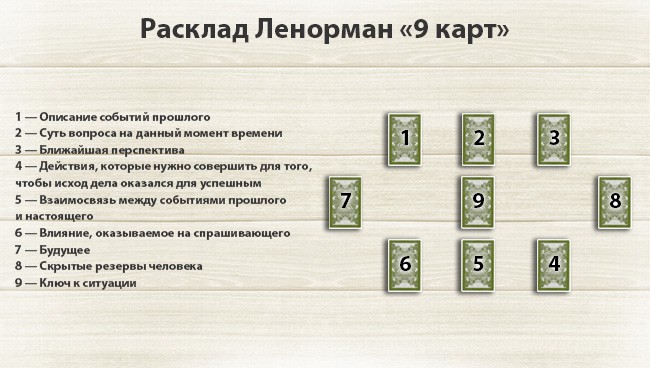 Сначала необходимо тщательно перетасовать колоду, после чего следует извлечь 9 карт и расположить их в 3 ряда, лицевой стороной вниз: будущее, настоящее и прошлое.