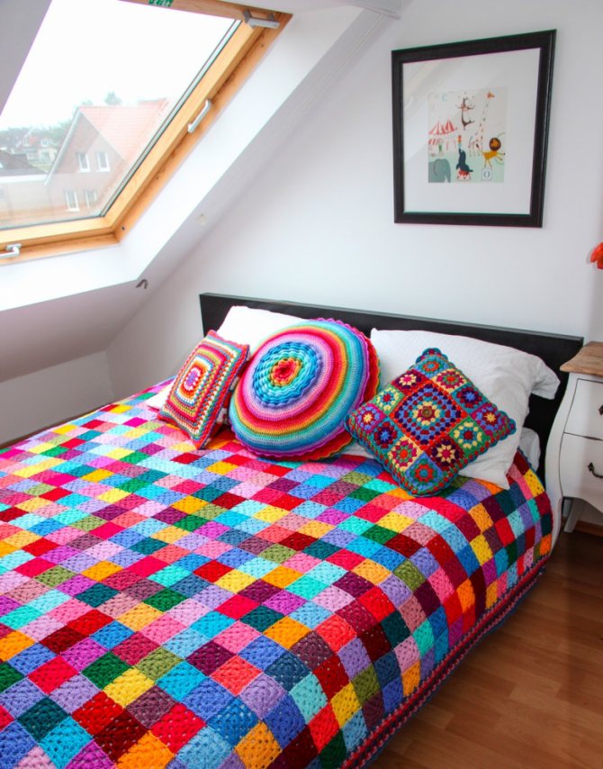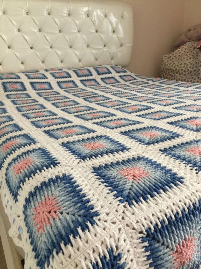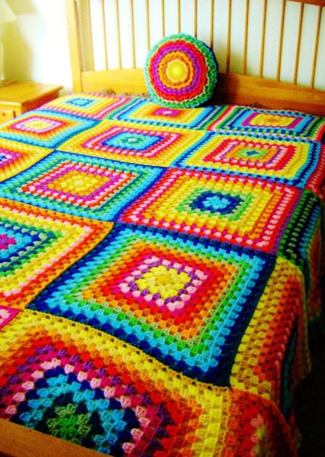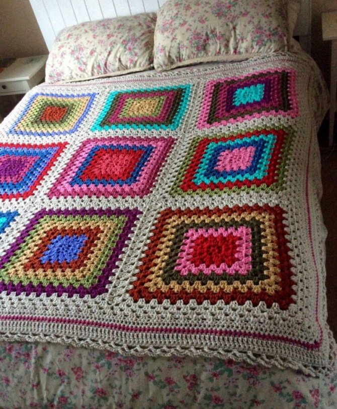 Оригинальный вид имеют изделия, где скомбинированы квадратные фрагменты разных размеров. Стильное покрывало получится из ажурных элементов. Если его постелить на контрастную ткань, в спальне появится яркий акцент. Из одинаковых фигур с помощью цвета можно составить необычные композиции.