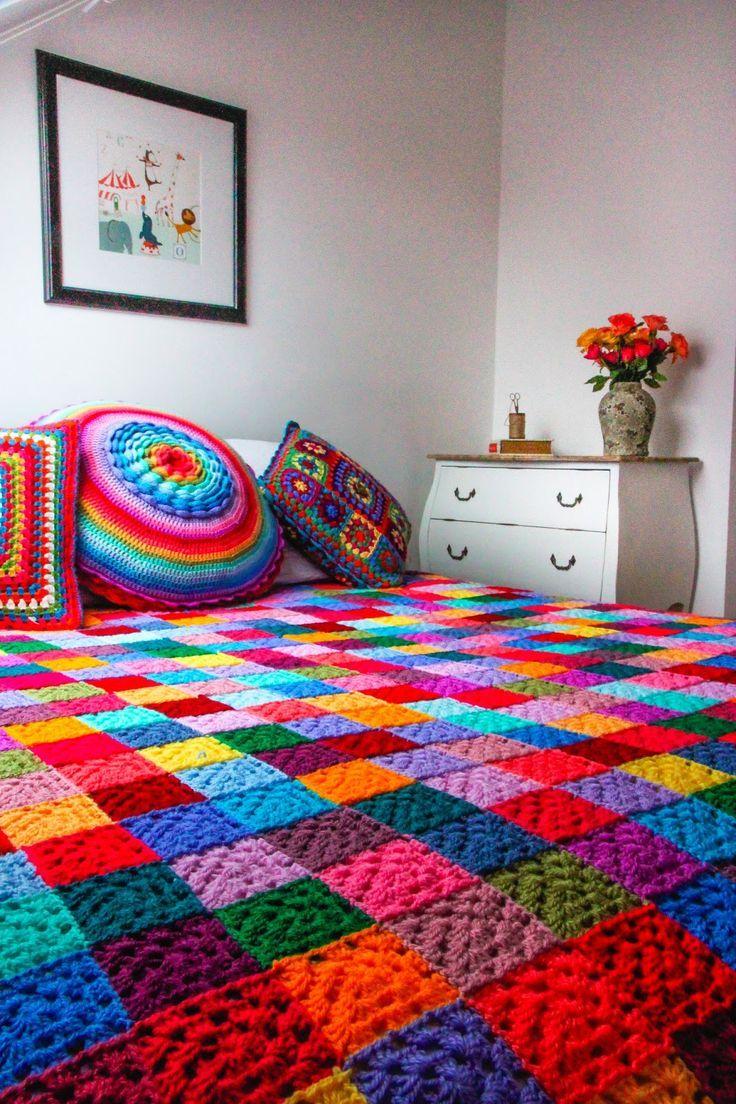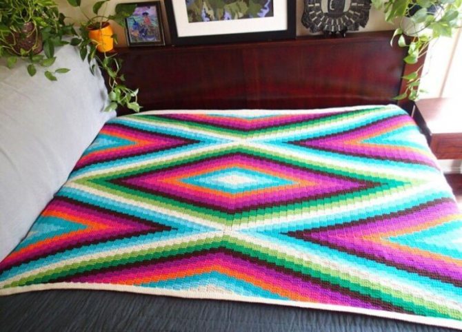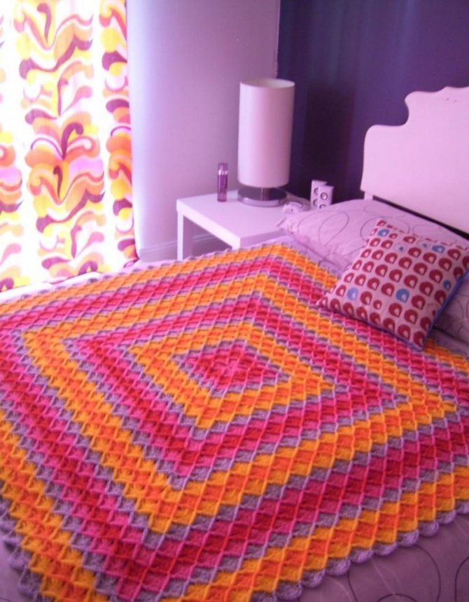 Благодаря данной схеме вязания получится шикарный яркий плед, который отлично украсит ваш диван в гостиной.