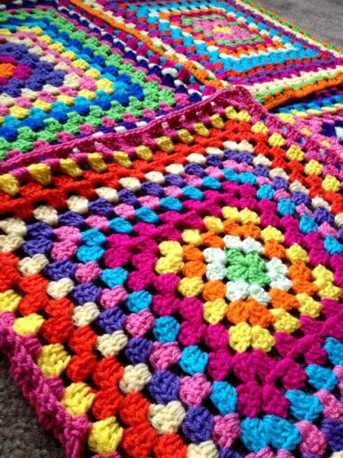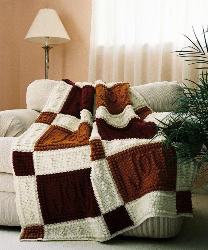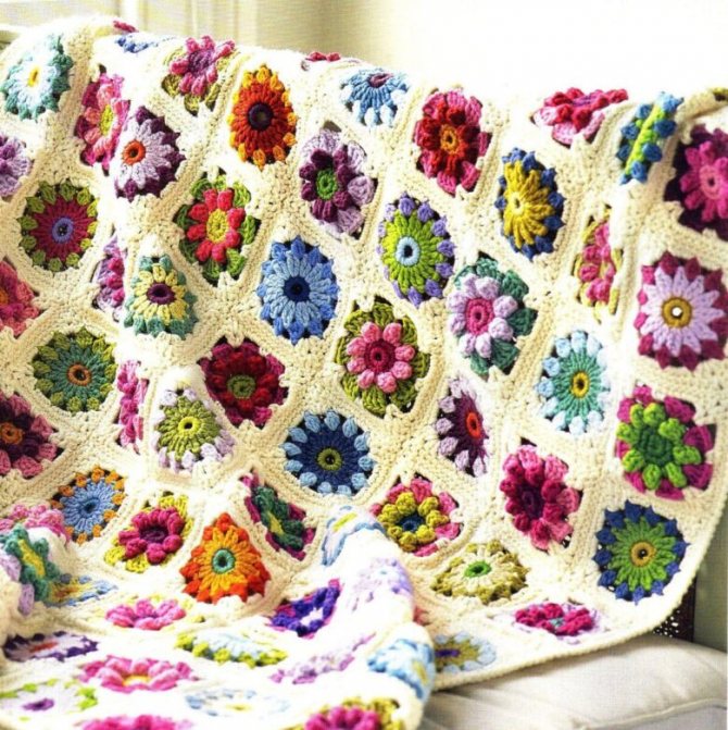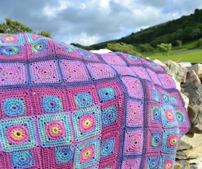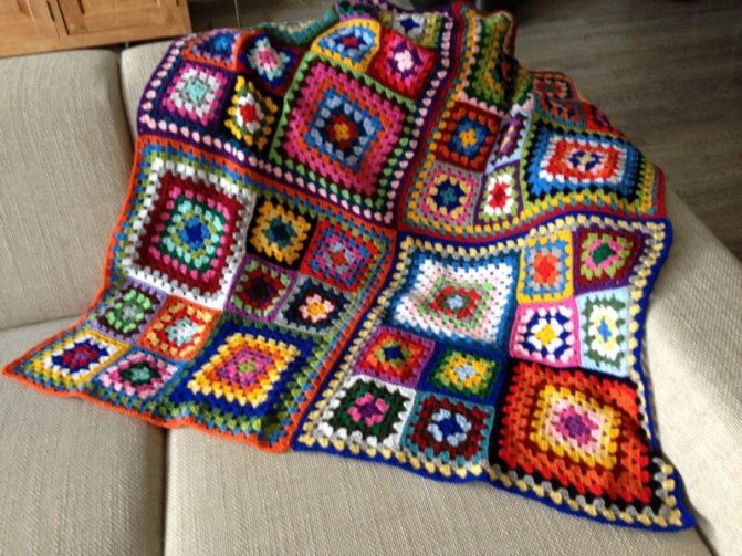 Каждый квадрат выполняется отдельно, затем сшивается в единое полотно. Возможны различные сочетания цветов и узоров. Объединяющим элементов станет обвязка всего пледа.