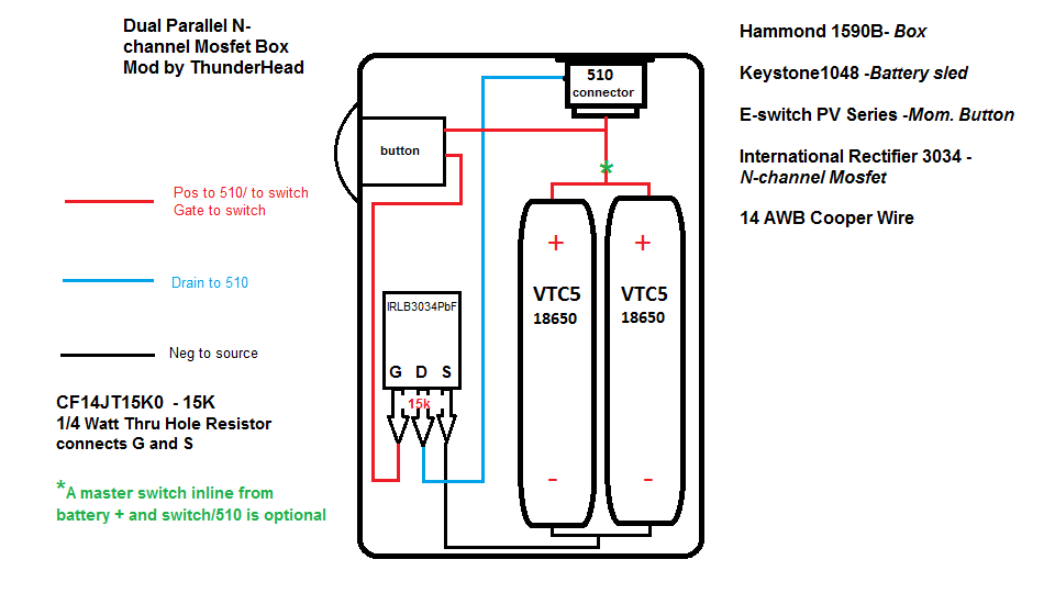 На этом изображении мы видим отличную схему – тут изнутри показана электронная сигарета своими руками. Здесь нужны всего лишь провода калибра 14 AWG Copper wire, 510-й коннектор, мосфет, кнопка и отсек под аккумуляторы. Все это можно достать, отправившись в магазин радиодеталей или заказав в интернет-магазине.