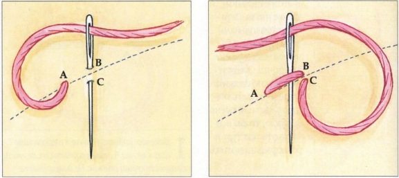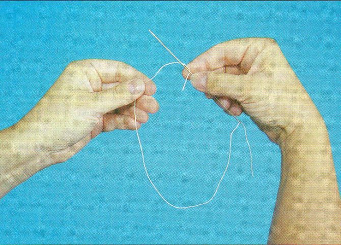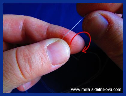 - 2-й: завязывание узла при помощи иголки. Иголку вставляют в петельку и тянут.
