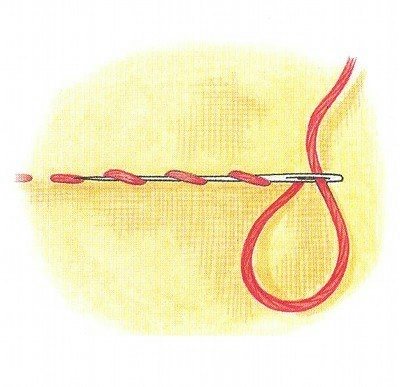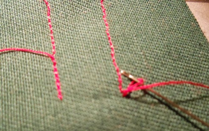 - 1-й: формирование петли. Для этого нужно пропустить иголку под завершающий стежок и потянуть ее с обратной стороны. Получится петелька из неиспользованной нитки, один конец которой продет в иголку, а второй выходит из ткани.