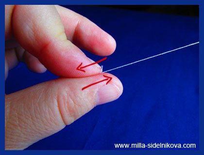 Сразу же, как только нитки сползли с указательного пальца, перехватываем их средним пальцем этой же руки и затягиваем пучок ниток вдоль нитки к её краю.