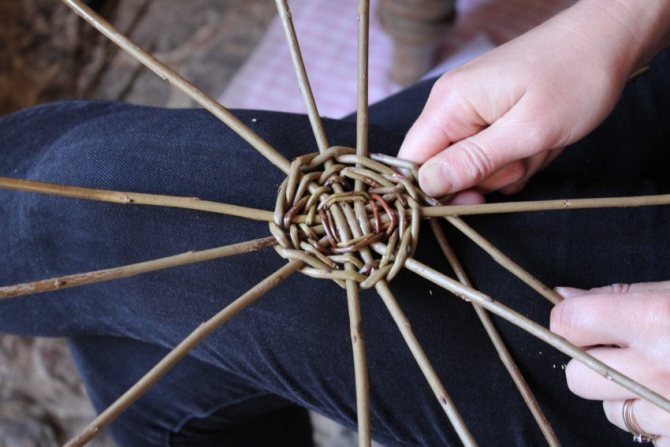 2. Следующий шаг – обплетение основания. Необходимо взять две ветки и обвести их вокруг четырех прутьев. Так следует сплести два круга. По завершению этого действия приступают к обплетению каждого из прутьев. Создаются еще два ряда. Элементы должны быть равномерно распределены. В результате плетения получается круг.