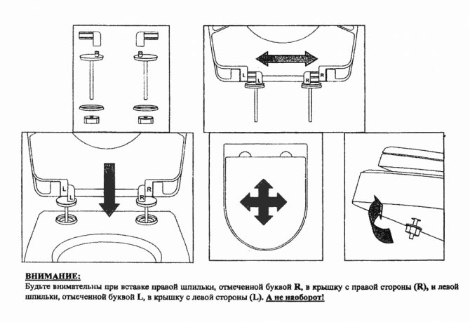 Металлические крепления свободно движутся в отверстиях, поэтому для регулировки положения крышки относительно бачка их нужно просто немного сместить вперед или назад, а затем аккуратно затянуть колпачки или крепежные гайки. Сами микролифты в этом случае разбирать не нужно.