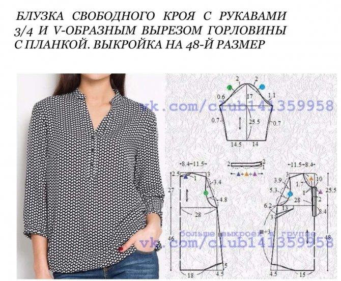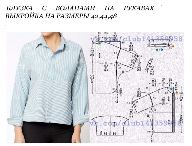 Выкройка блузки с рукавом фонарик из шитья выполнена по принципу построения лекала Варианта № 4. Расширение, а впоследствии и созборивание рукава, производится только по верхнему окату.