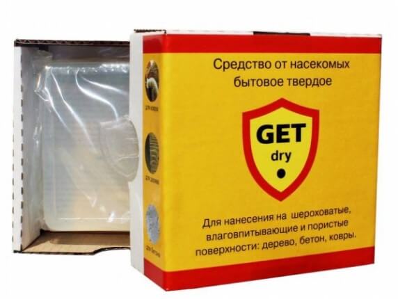 Продается в форме жидкости, расфасованной в емкости по 100 мл. Воздействует как на взрослых особей, так и на личинок. Вещество относится к 4 классу токсичности и только в отдельных случаях способно нанести вред человеку. Мух же Get уничтожает наповал.
