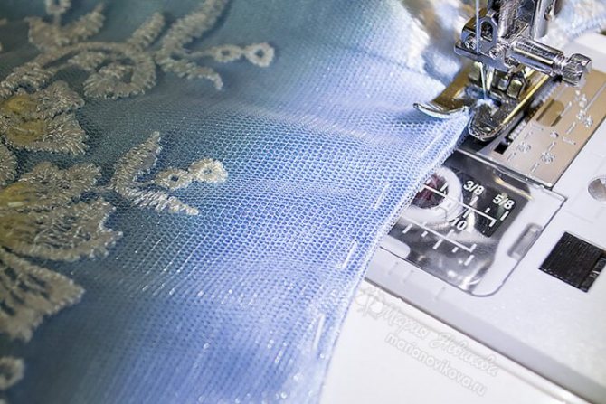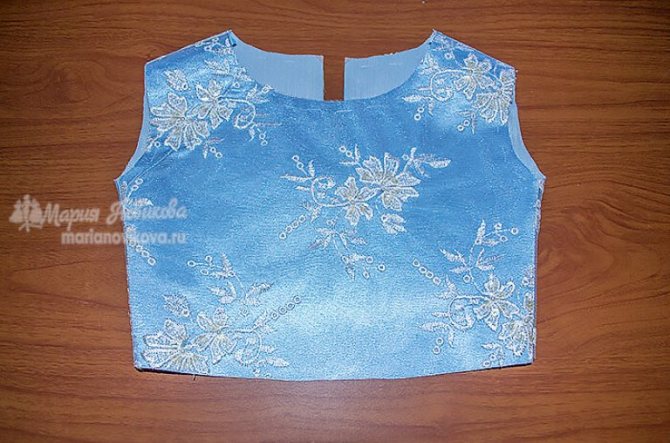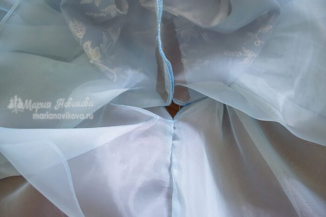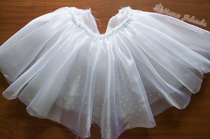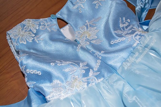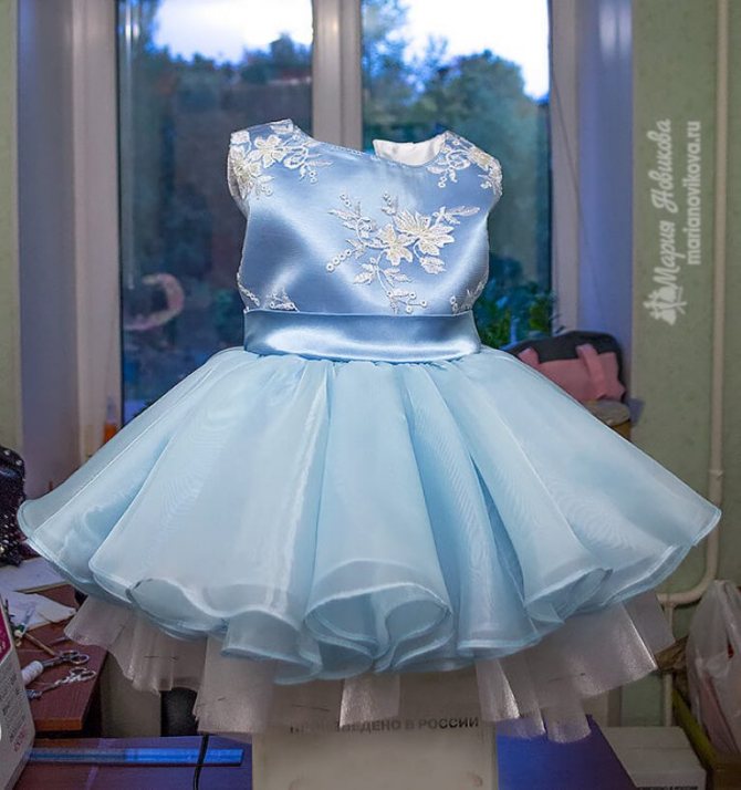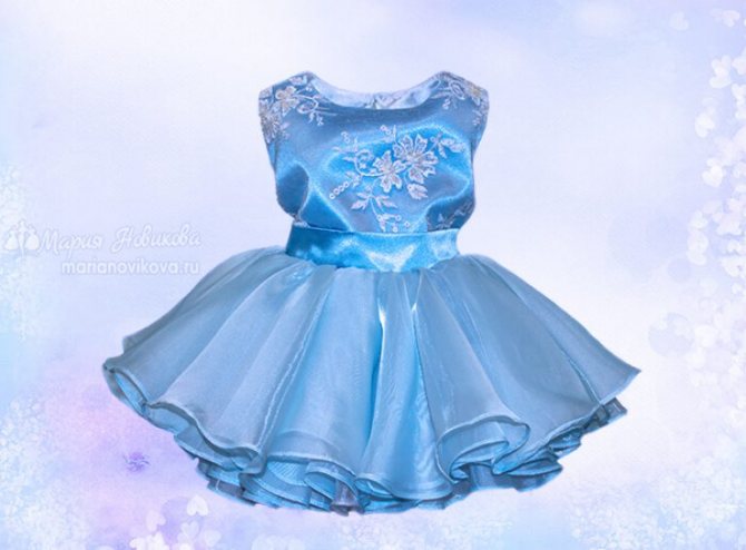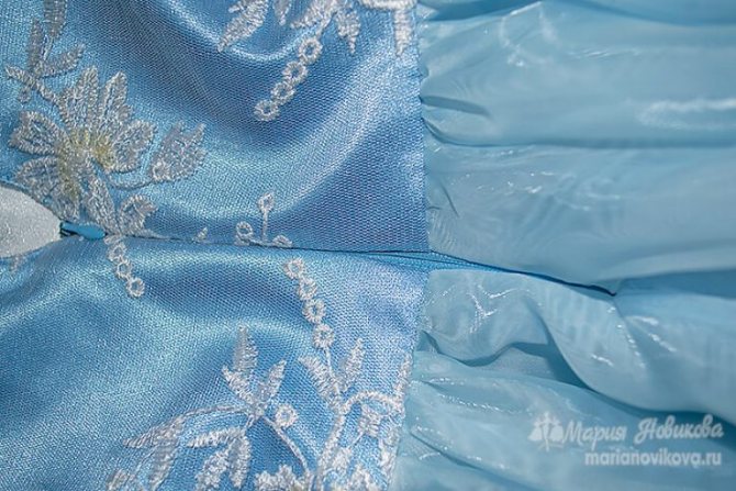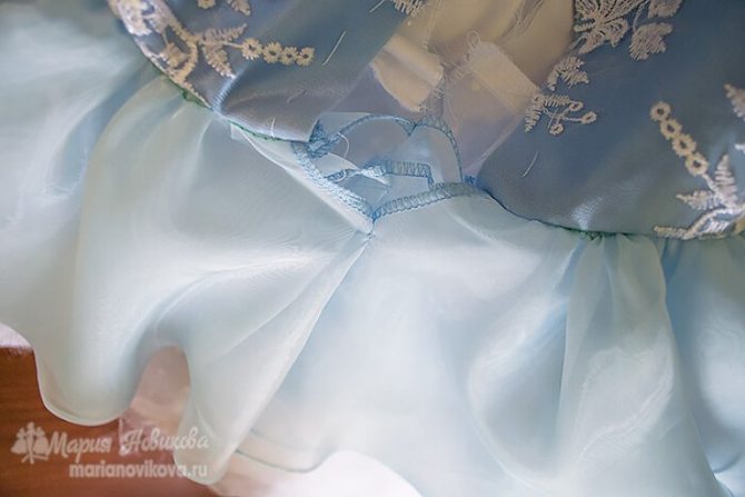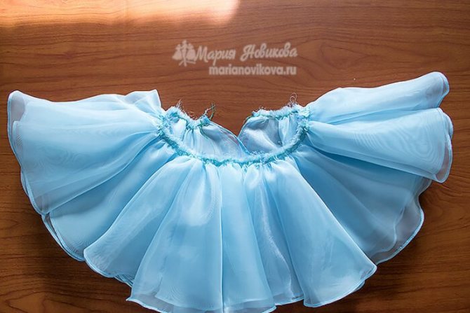 Юбочка состоит из верха и низа. Длина верхней части составляет 35 сантиметров + 1-1,5 сантиметра припусков на швы. Верхняя юбочка сшита из органзы голубого цвета и состоит из трёх слоёв. Каждый слой – двойное солнце + одно полусолнце. Таким образом, мы избавимся от обрезков ткани и избежим обилия фатина, который присутствует практически в каждой пышной детской юбке.