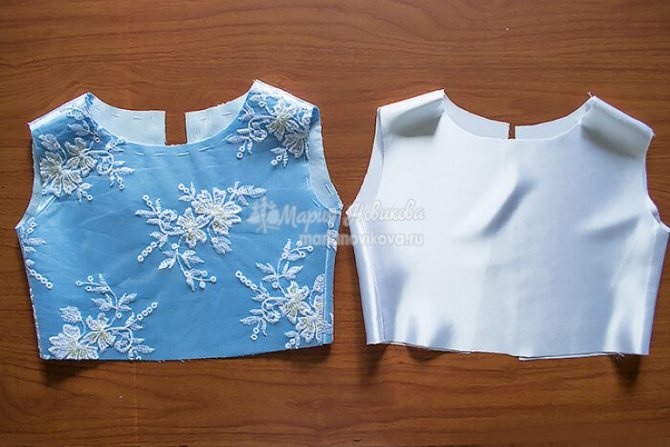 Точно так же выкраиваем кокетку из тонкого, слегка тянущегося кружева, ткани для подклада и клеевой ткани.