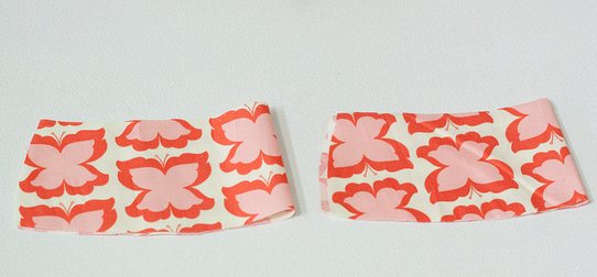Теперь обрабатываем проймочку рукава. Из куска такой же ткани под углом 45° вырезаем косую бейку – полоски шириной 2,5 сантиметра. Обшиваем проймы рукавчика, как показано на фото.