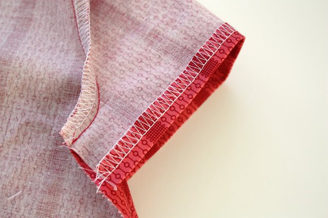Далее складываем части рукавчика и туловища лицевыми сторонами внутрь, проймы совмещаем и закрепляем булавками. Повторяем то же самое со вторым рукавчиком. На оверлоке или на машинке швом «зиг-заг» обрабатываем проймочки и разглаживаем швы.