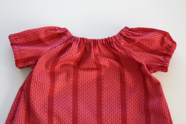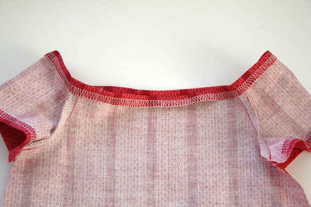 С более длинной стороны подгибаем и прошиваем. После этого пристрачиваем рукава к платьицу.