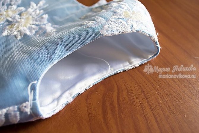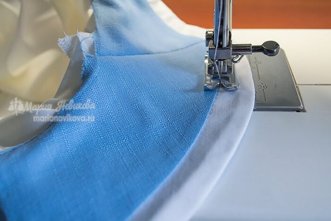 Чтобы подклад готового платья не вылезал наружу, перед соединением срезаем припуск по горловинке, разрезу и проймочкам на 2-3 миллиметра. Затем аккуратно приутюживаем все строчки через хлопчатобумажный проутюжильник.