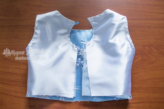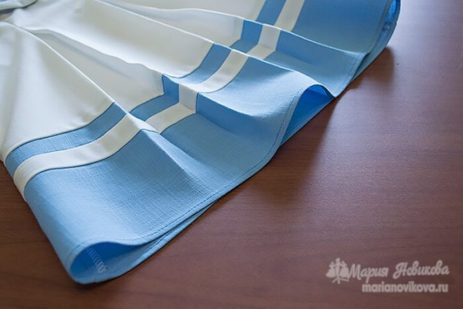 Выкраиваем поясок из голубого атласа под углом 45° – такая деталь будет более эластичной, а это крайне важно ввиду быстрого роста деток. Ширина готового пояска составляет 6 сантиметров (в раскроенном виде: 12 + 1,5 сантиметра припусков на швы), длина – 160-180 сантиметров. Обтачиваем поясок с концов, серединку оставляем открытой (длина отрезка равна ширине полочки). Делаем надсечки в конце швов, чтобы выправить припуск. Высекаем углы, вымётываем по пояску кантик в раскол, приутюживаем, удаляем временные нити.