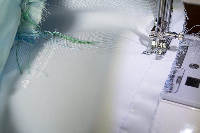 Прострачиваем на швейной машинке край подгибки, который находится вокруг горловины – в него мы также вставим резинку, поэтому в самом начале шва оставляем небольшое отверстие.
