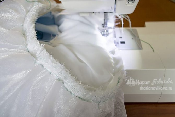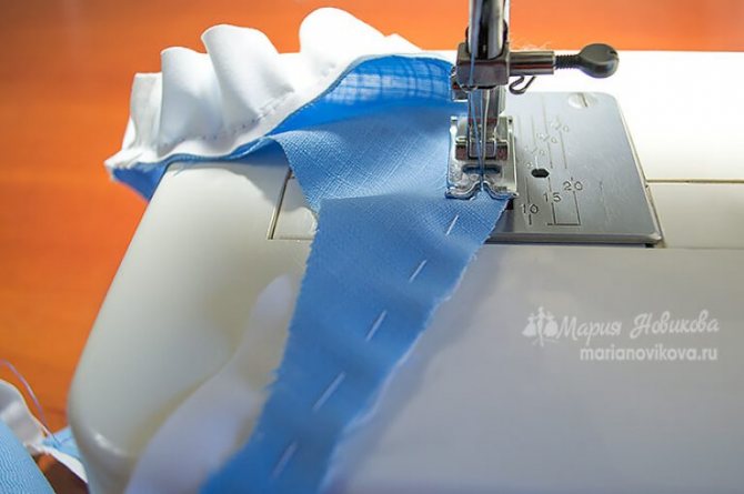Устанавливаем на швейной машинке наиболее широкую прямую строчку и прострачиваем линию горловинки. Потянув за один хвостик нитки, формируем сборку.