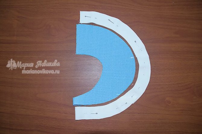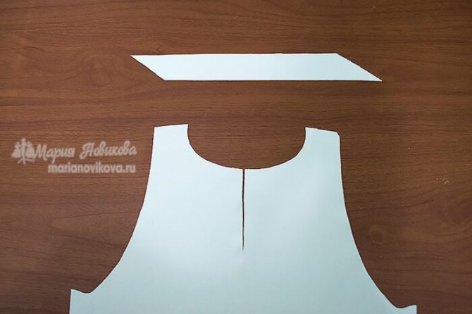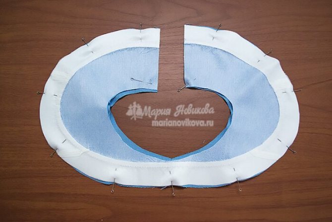 Чтоб обтачка в готовом виде была ровной (без заломов), кроите её чуть меньше внешнего среза воротничка.