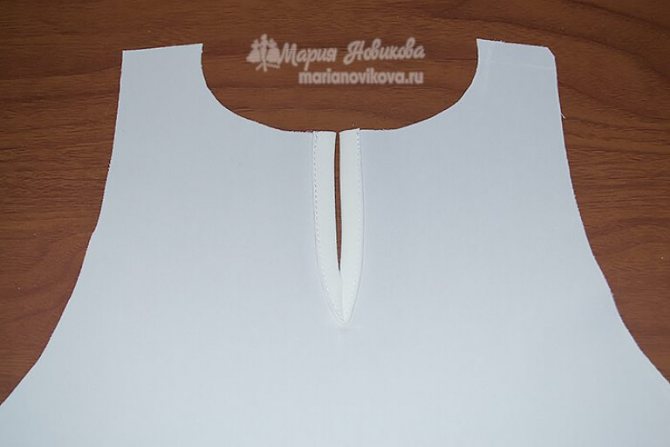 Соединяем деталь кокетки с подкладом по горловинке и проймочкам. Обтачиваем горловинку вместе с вырезом и воздушной петелькой.
