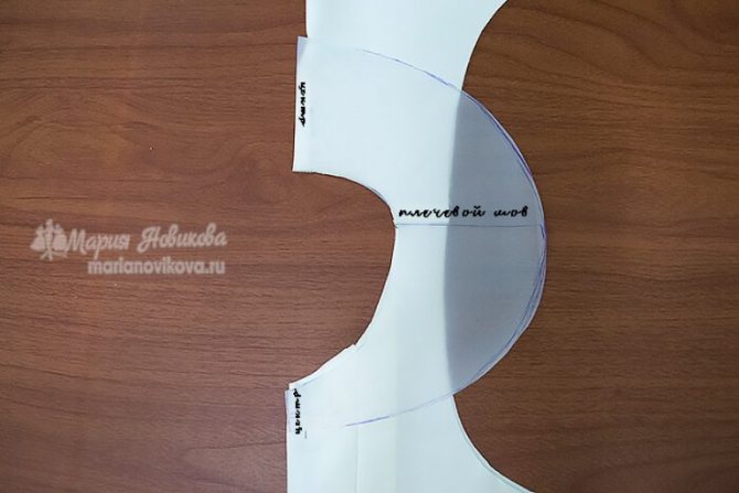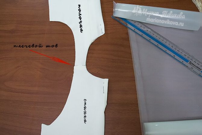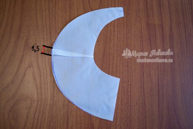 Разрезаем бумажную заготовку воротничка по плечевому шву, не доходя до горловинки 1-2 миллиметра. Накладываем друг на друга конечные плечевые отметки, одна заготовка заходит на другую на 1,5-3 сантиметра. Фиксируем заготовку с помощью степлера или скотча.