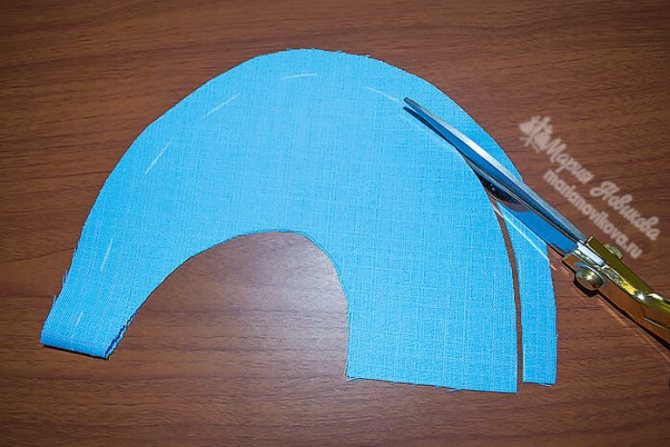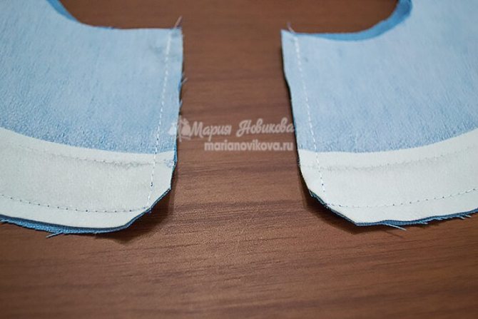 На припусках для швов в вогнутых местах выполняем надсечки, выворачиваем деталь кокетки на лицо и вымётываем кантик по горловинке, разрезу и проймочкам.