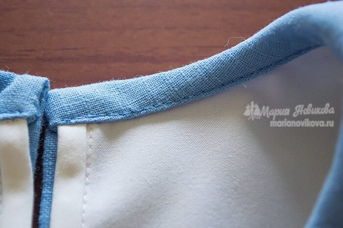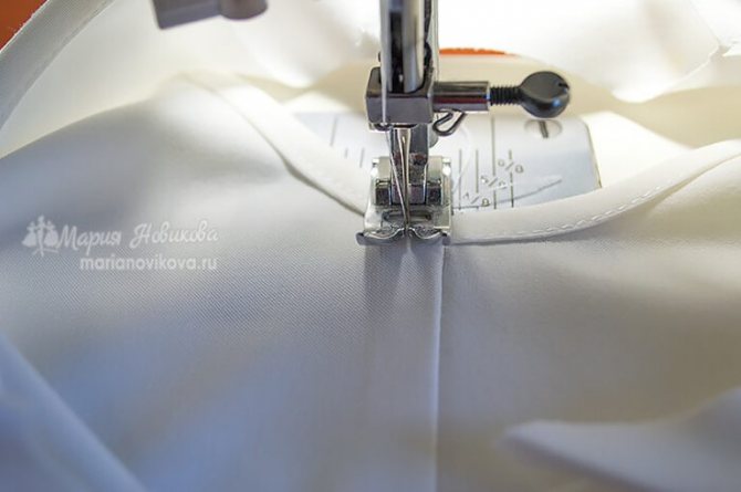 Втачиваем верхний воротничок в горловинку, строчка при этом проходит на расстоянии 1-2 миллиметра от сгиба.