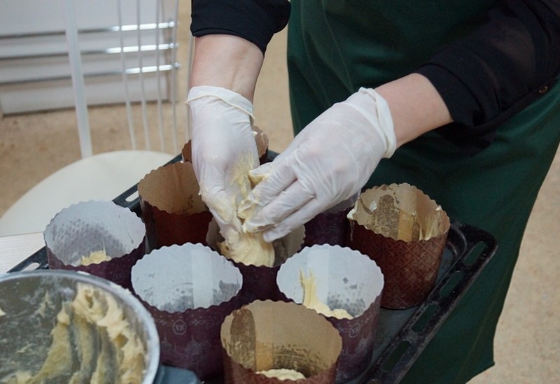 - поднявшееся тесто осторожно вымешивают и заполняют им смазанные растительным маслом формы примерно на 1/3;