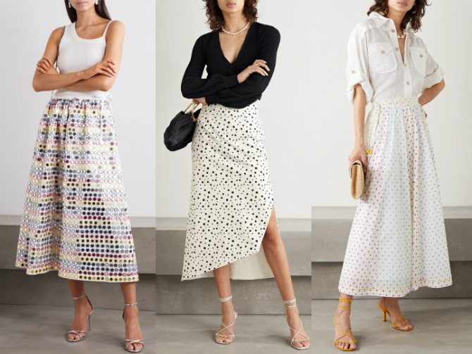 8. Хлопковые юбки-миди с перфорациями или кружевными вышивками. Смотрятся такие варианты вовсе не повседневно, а довольно эффектно.