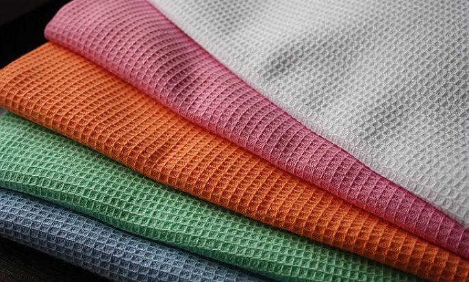 - Отличная способность впитывать жидкость. Текстиль из вафельной ткани по этому показателю превосходит обычное изделие из хлопка в несколько раз. Кроме того, материал с клетчатой структурой способен поглотить не только простую воду, но и пролитое масло, краску или бензин.