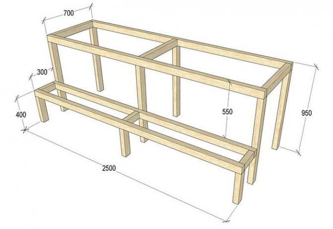 Сначала необходимо собрать из ДВП прямоугольный ящик-основание. Прикрепить на внутреннюю часть боковин ножки и направляющие из бруса впритык друг к другу. В центре ящика установить распорку из ДВП, днище зашить фанерой.