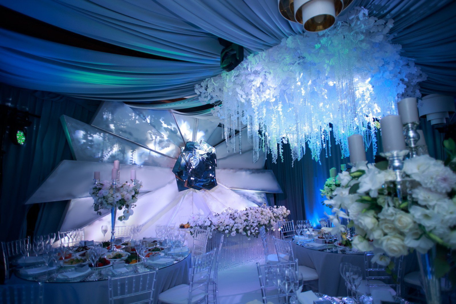 Как правило, зал оформляют в природном стиле — используют голубые, белые и серебристые тона и другие холодные тона. Для декорирования зала на февральскую свадьбу подойдут также стили:
