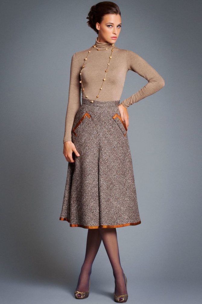 - Твид. Это шерстяной материал с рельефной поверхностью. Он практичный, теплый, позволяет добиться четких складок на юбке. Благодаря своей фактуре материал придает дополнительный объем, что особенно важно для женщин с очень узкими бедрами. Полным же дамам лучше отказаться от такой ткани.