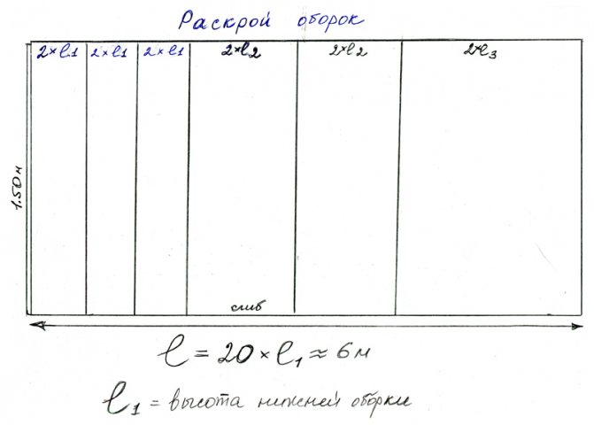 Следующим этапом будет расчёт ткани на каждую оборку. Измеряем длину каждой размеченной линии пришива оборочки. Умножив её на три, получаем нужную длину заготовки.