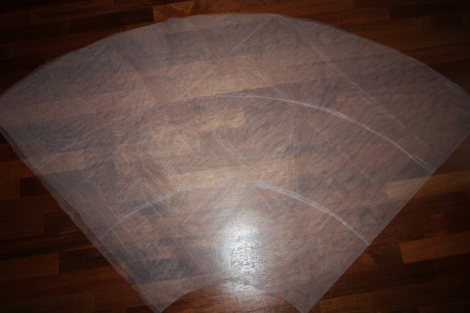 Размечаем контуры на ткани с припусками в полтора см на талии и боковом шве. По нижнему срезу припуск не предусматриваем, так как срезы на фатине не обрабатывают.