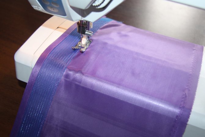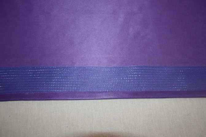 Регилиновую ленту накладывают на изнаночную сторону ткани, отступив 5 мм от края. Пристрачивают и подворачивают. Край пришивают.