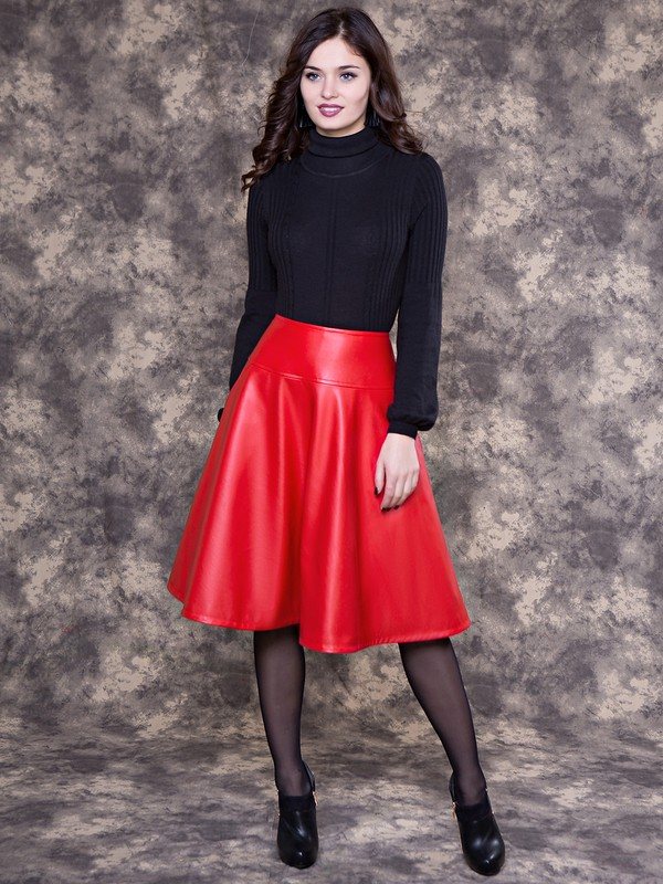 - Кожа. Материал подойдет для тех модниц, которые не боятся экспериментировать. Лучше использовать средние или длинные модели. Благодаря естественному блеску кожи складки создают красивые переливы, поэтому образ будет ярким, даже если верх темных тонов. Недостаток материала – высокая стоимость.