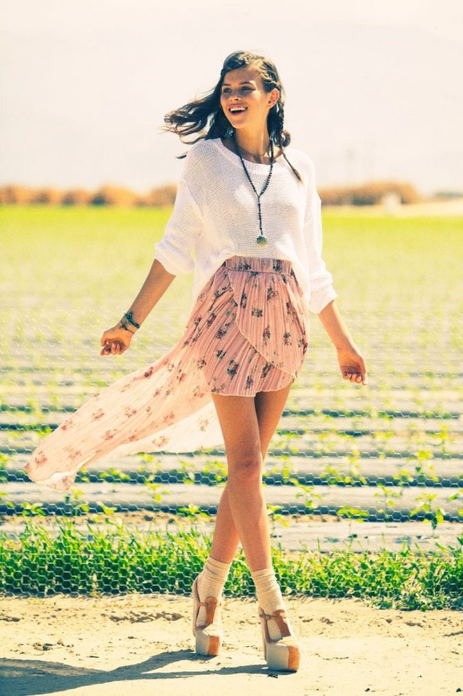Создает солнечный и яркий лук. Становится основной для создания лука ретро. Привлекательны модели с низом в виде волны.
