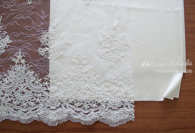 Материалы для платья ампир использовались лёгкие и струящиеся: шёлк, шифон, кружево, атлас и т.п. Поэтому ткань мы выбрали с Екатериной тонкое кружево с вышивкой и натуральный шёлк-атлас.