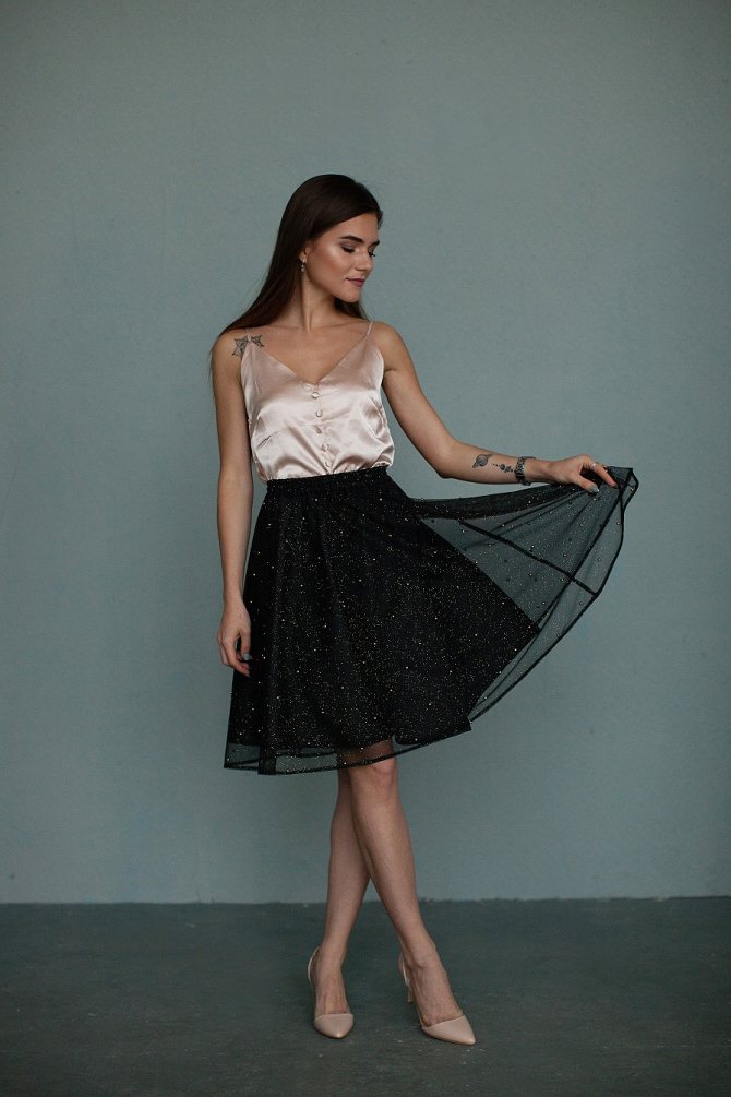 - Фатин. Легкий, гладкий материал, из которого чаще шьют праздничные изделия. От его жесткости зависит объемность юбки. Сочетать его можно с разными блузками и топами. Недостатки фатина: сильно электризуется, может деформироваться при нахождении рядом с обогревательными приборами.
